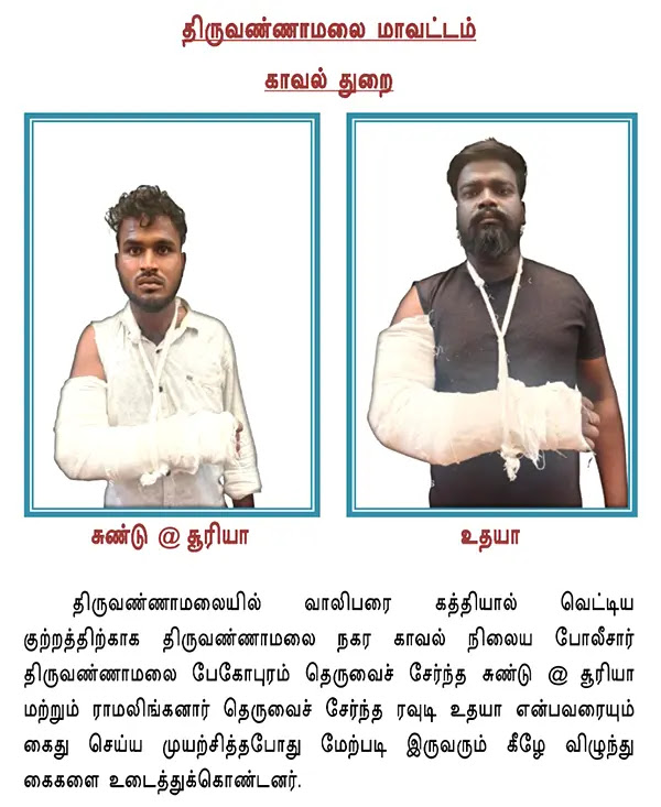 திருவண்ணாமலையில் காய்கறி வியாபாரியை கத்தியால் வெட்டியவர்கள் தப்பிச் சென்ற போது கீழே விழந்ததில் அவர்களது கை எலும்பு முறிந்தது.